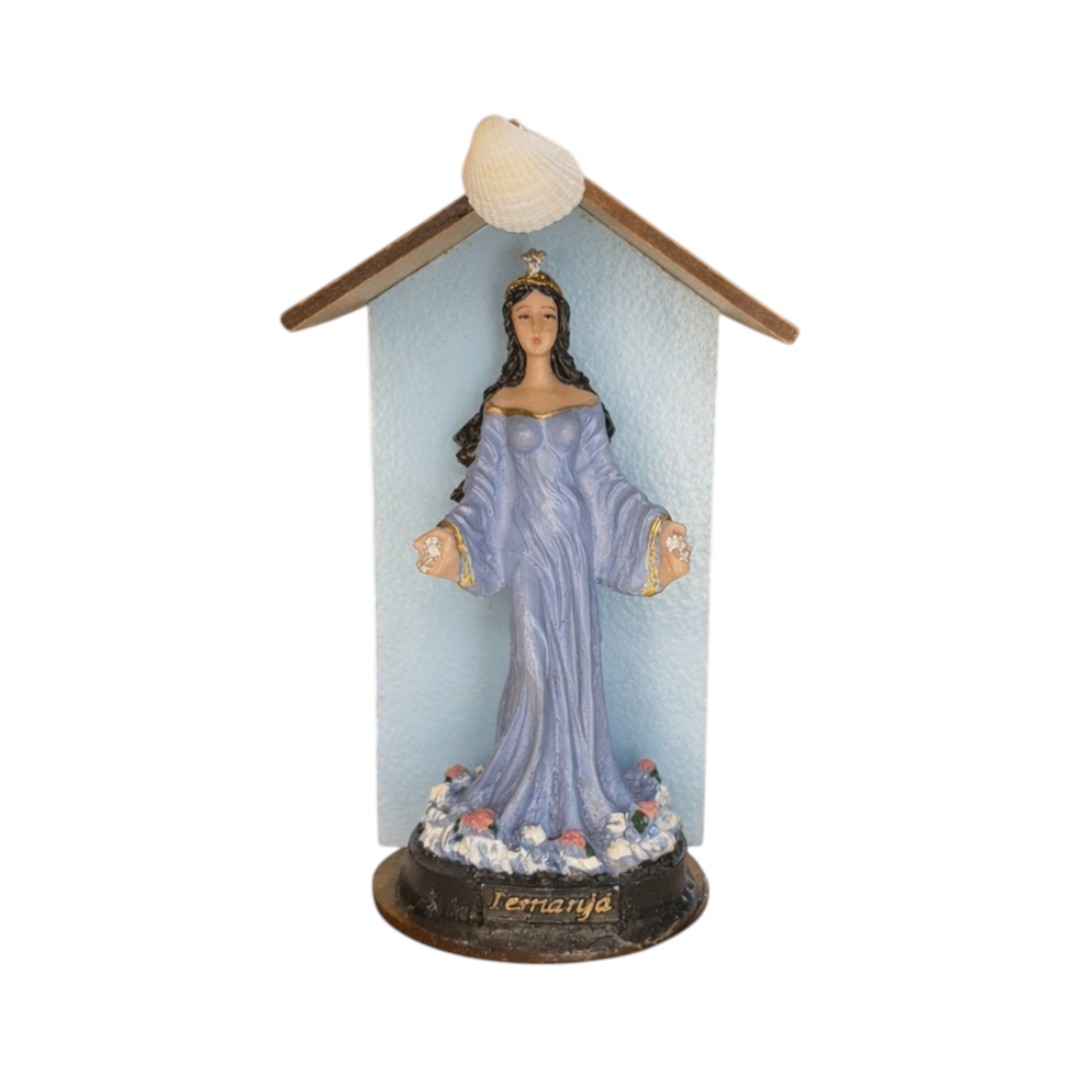 Cada detalhe foi pensado para transmitir paz: o vestido fluido em tons suaves, o brilho delicado da pintura artesanal e a concha decorativa que coroa o oratório — símbolo da força das águas e da energia maternal de Iemanjá.