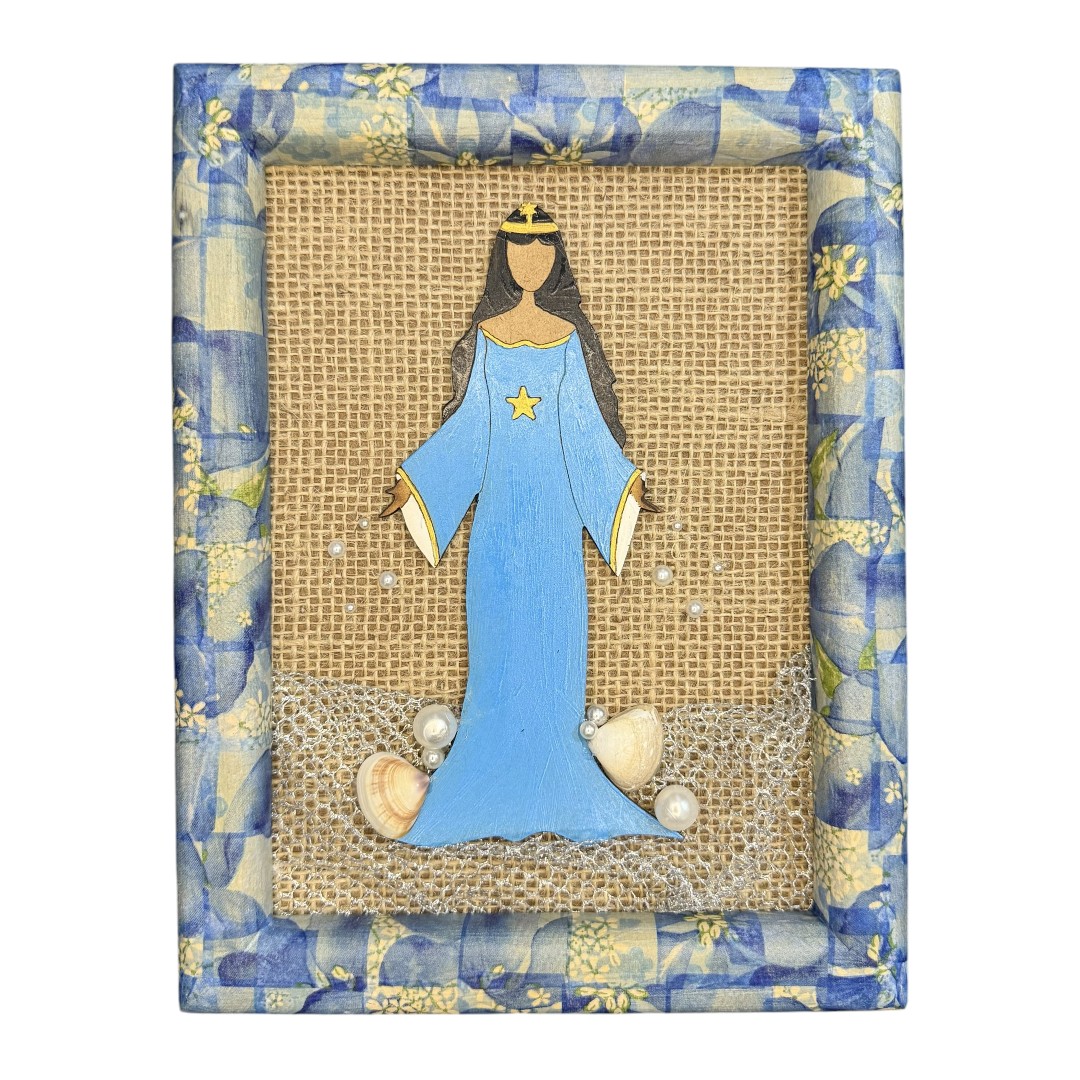Leve a serenidade da Rainha do Mar para o seu ambiente com este Quadro Artesanal de Iemanjá. Uma peça exclusiva do Galinheiro Arte, feita à mão com materiais que evocam a força das águas. É a escolha perfeita para quem busca decoração religiosa com significado, seja para compor um altar ou presentear alguém especial com fé e arte.